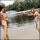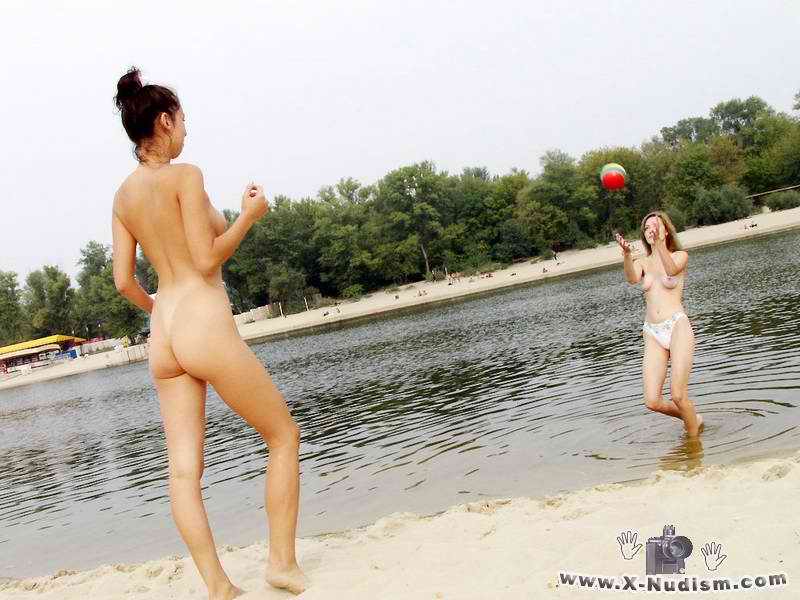 tanned beauties playing volley-ball,
